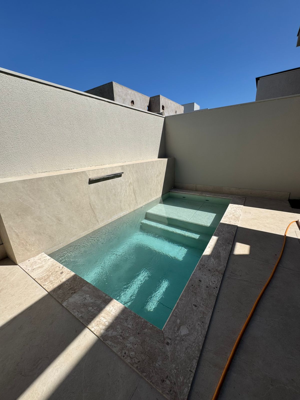 Piscina com cascata, hidromassagem, prainha, iluminação e acionamento via controle remoto