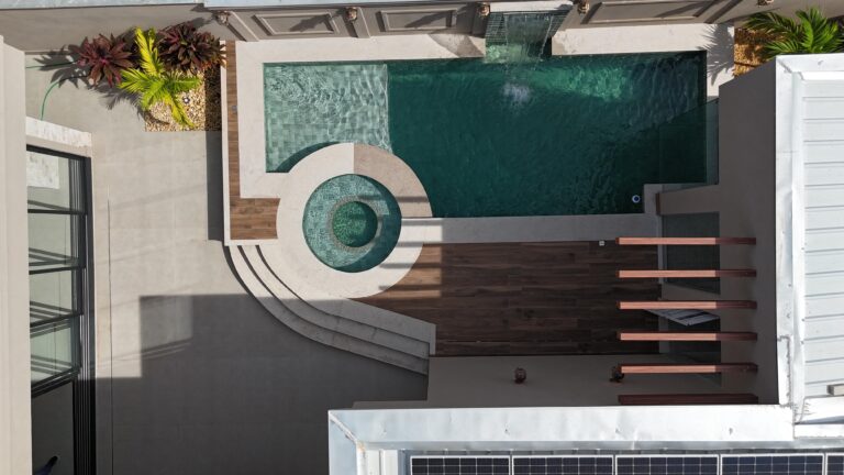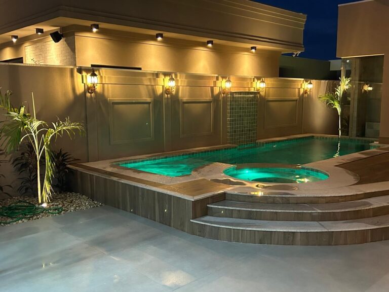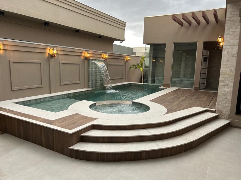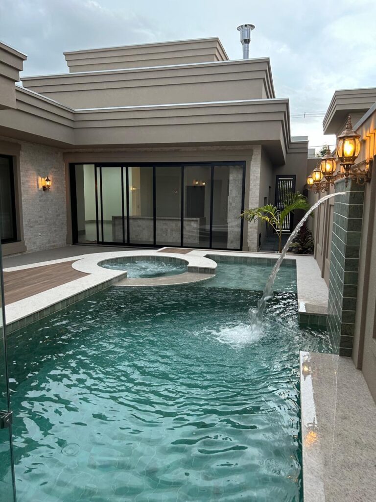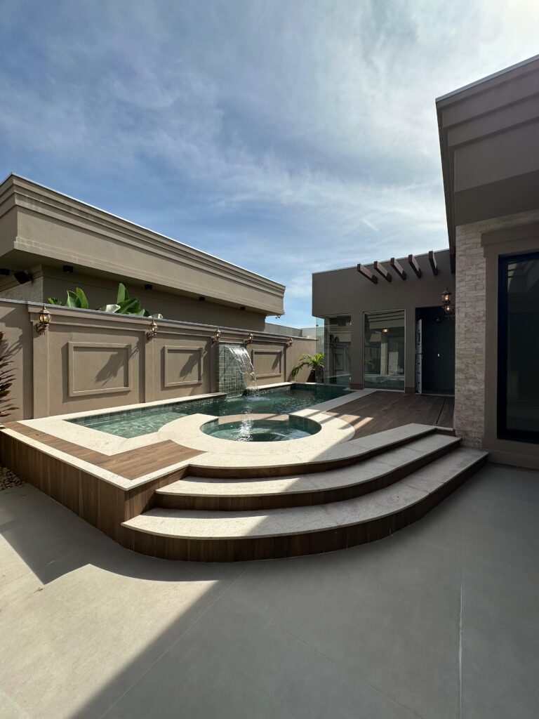 Piscina automatizada com ilha, hidromassagem, cascata, iluminação em LED e aquecimento com trocador de calor