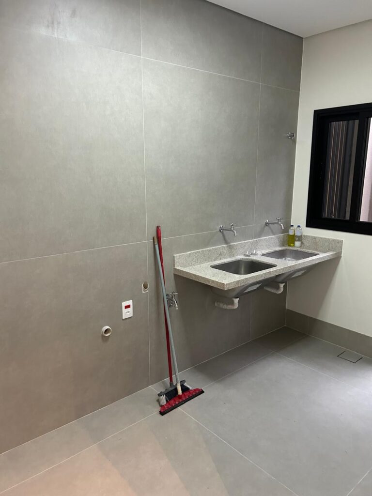 Cozinha com churrasqueira, exaustor de fumaça, duas cubas e ilha com aproximadamente 3,6 metros