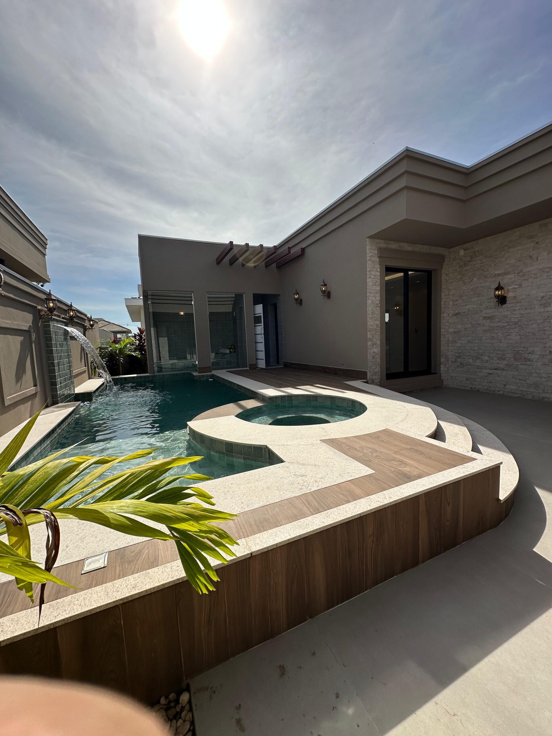 Piscina automatizada com ilha, hidromassagem, cascata, iluminação em LED e aquecimento com trocador de calor