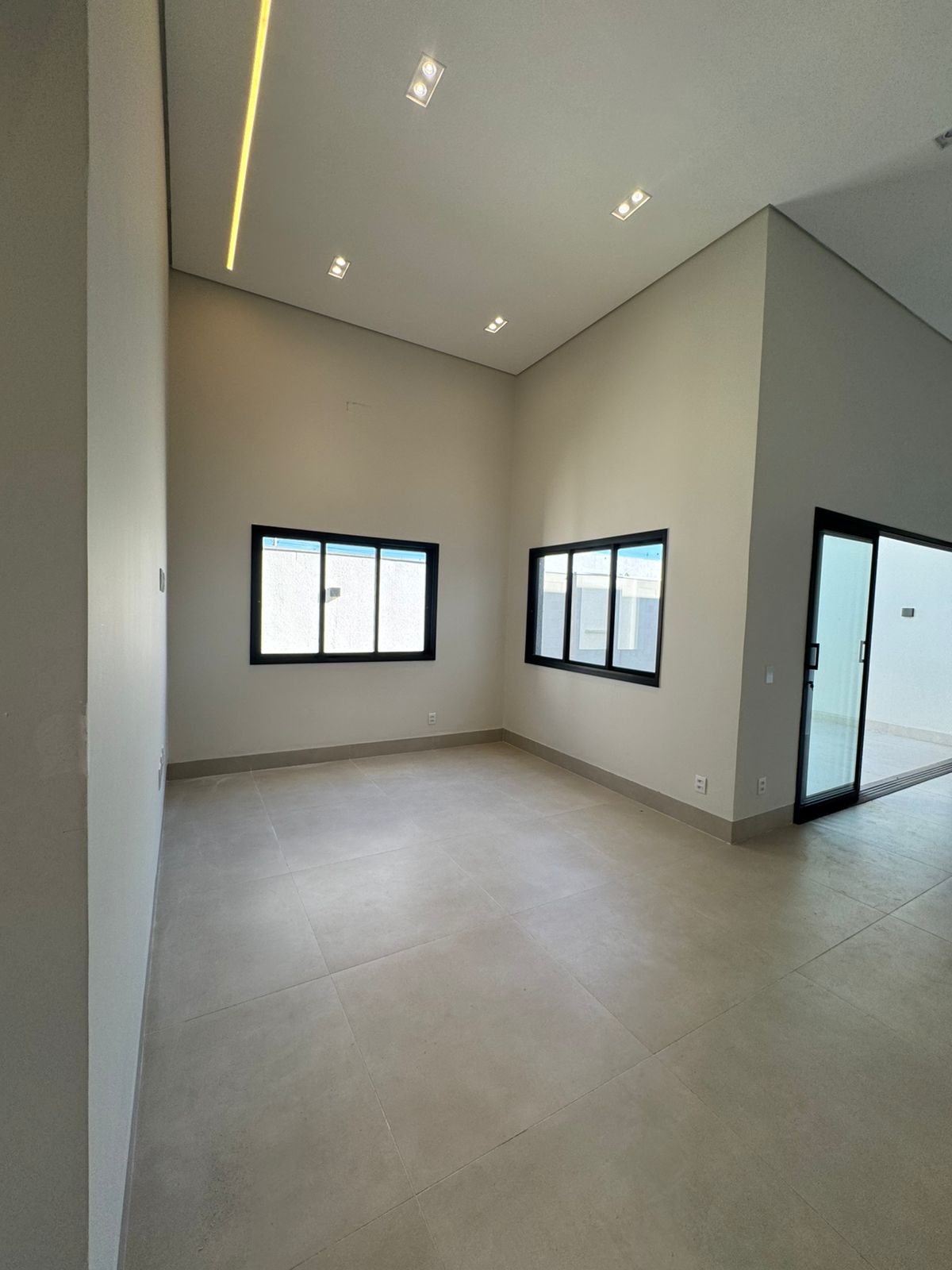Sala de estar ampla com pé direito alto e excelente iluminação natural