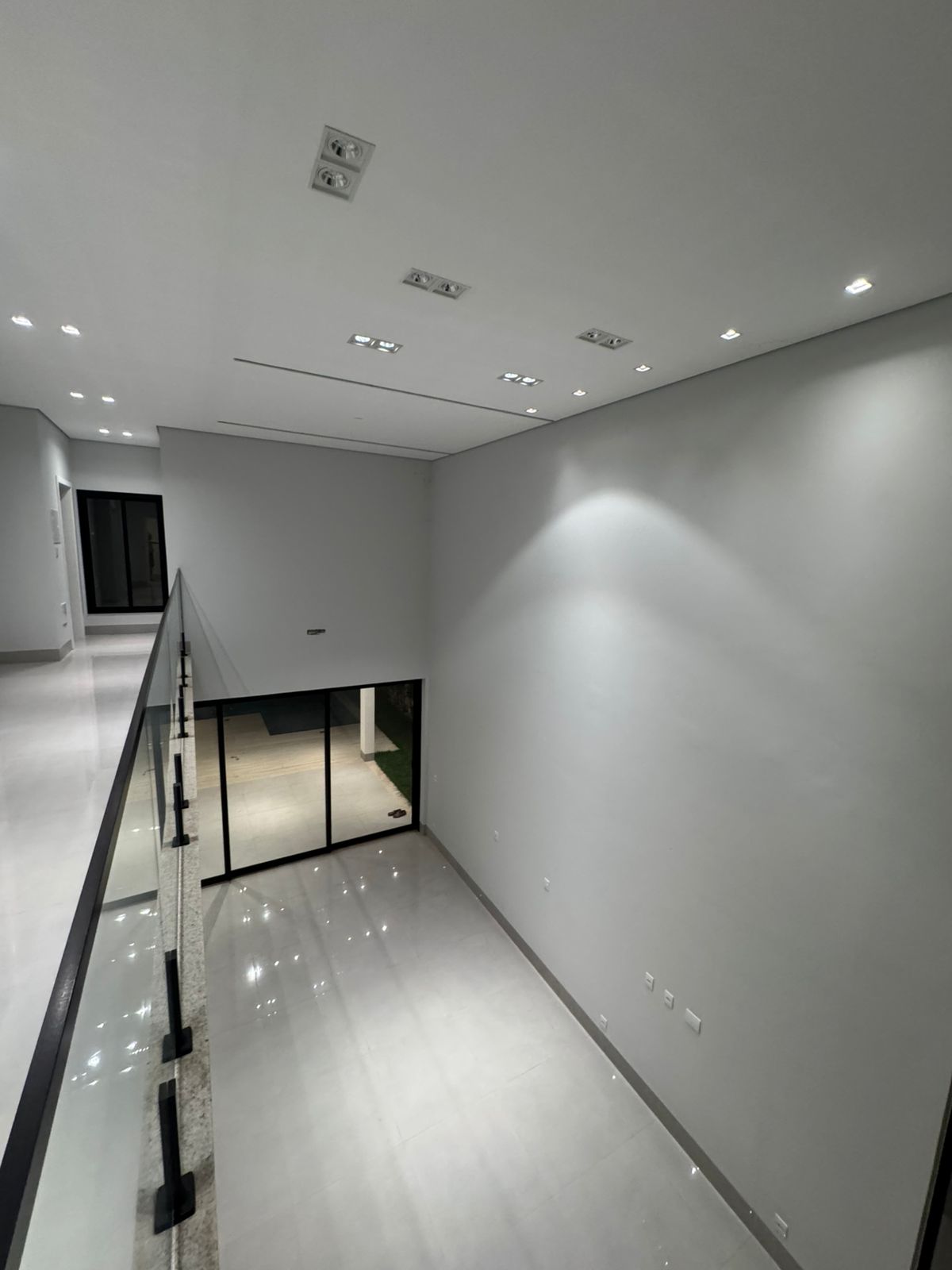 Sala com pé-direito duplo e mezanino.