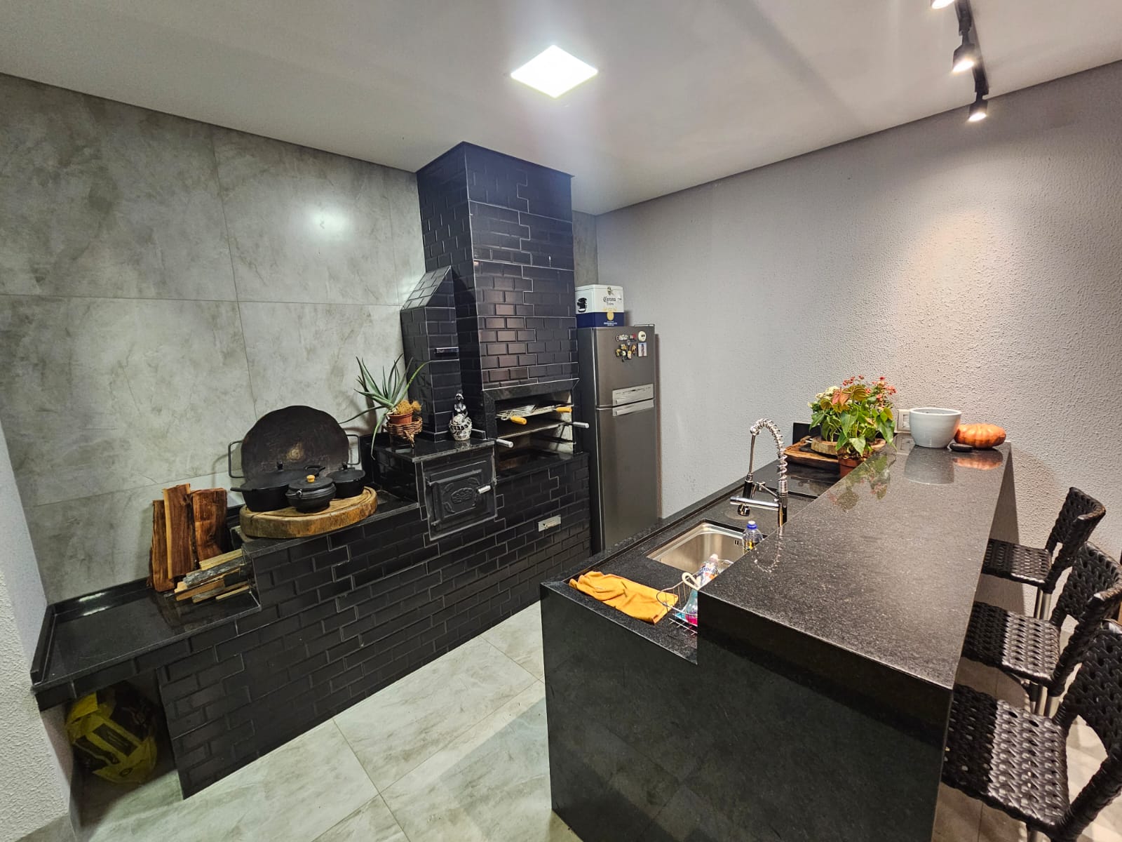 • Espaço gourmet externo com fogão a lenha.