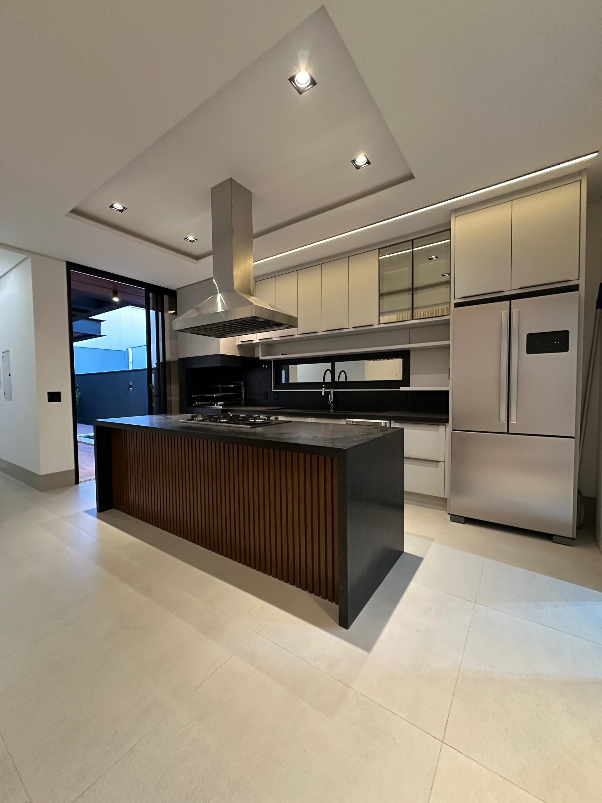 Cozinha gourmet com ilha em granito, forno a gás, cooktop 5 bocas, geladeira inox 3 portas, lava-louças e bebedouro